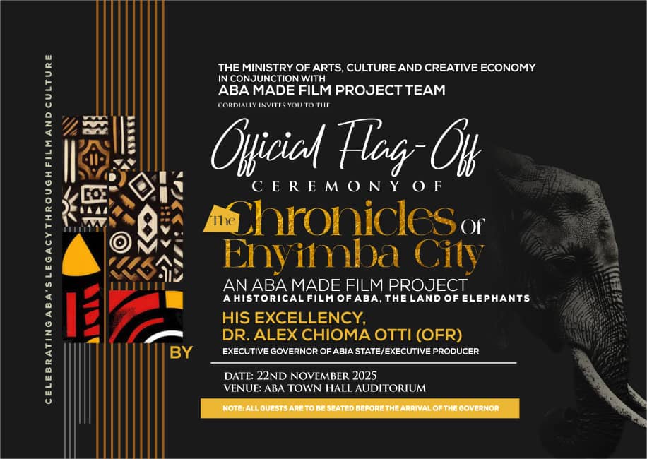 The film project, a historical film of Aba which is done by the Abia State Ministry of Arts, Culture and Creative Economy in conjunction with the Aba Made Film Project Team, will be officially flagged off on Saturday, the 22nd of November, 2025, at the prestigious Aba Town Hall Auditorium by 11 am.