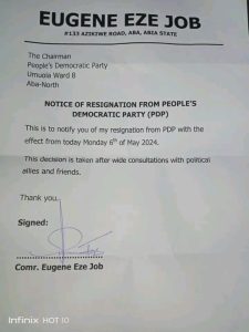 A former National Union Road Transport Workers chairman, Eugene Eze Job has resigned from the PDP.