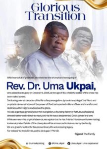 With hearts full of gratitude, we celebrate the triumphant homegoing of Rev. Dr. Uma Ukpai, who passed on to glory on October 6, 2025, at the age of 80.