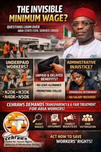CEHRAWS has received multiple reports suggesting a troubling disparity between officially communicated wage policies and the actual earnings of civil servants. While the Federal Government, under the framework of the National Minimum Wage Act, prescribes a benchmark for workers’ remuneration, there are allegations that Abia State workers are subjected to a de facto wage regime that appears inconsistent, unclear, and, in some instances, below expected standards.